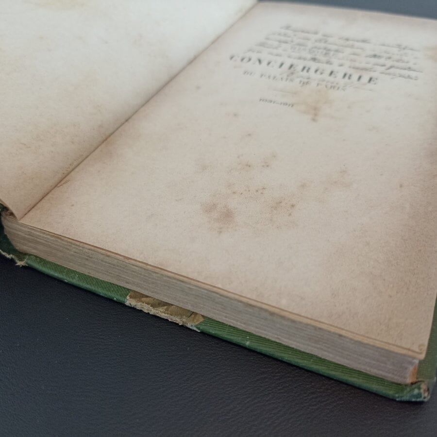 This copy of the book Histoire de la Conciergerie du Palais de Paris (1031–1911) deals with the history of one of Paris's most emblematic buildings, which over the centuries served as a royal residence, revolutionary court, and prison. The Conciergerie became especially famous for having housed celebrated prisoners during the French Revolution, such as Marie Antoinette and the Girondins. The work offers a detailed historical overview of the building and its role in the political and social transformations of France.